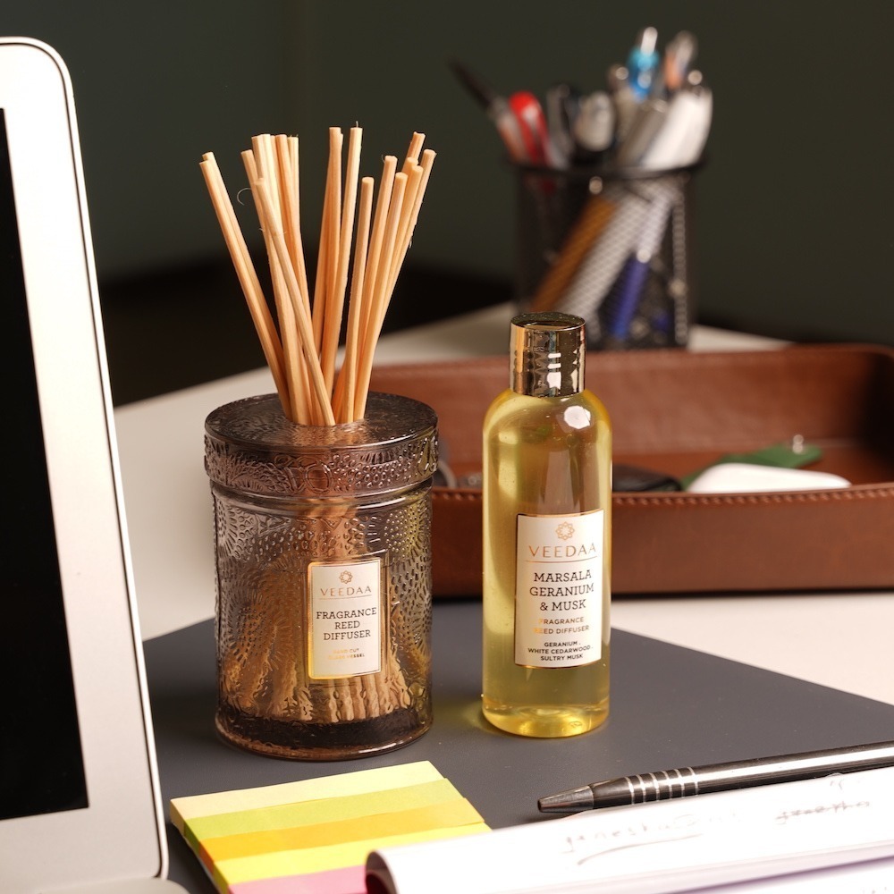 Jar & Packaging Description: A pure essential oil blend is poured into this hand cut glass vessel. Natural rattan reeds are given which release the fragrance. Rich colors adorn the packaging, which reflects a floral and contemporary mosaic design. The Reed Diffuser is ideal for Bathrooms, Washrooms, Bedrooms, Office Cabins / Cubicles, Closets, Dressing Rooms, Study, Den, Yoga Rooms.