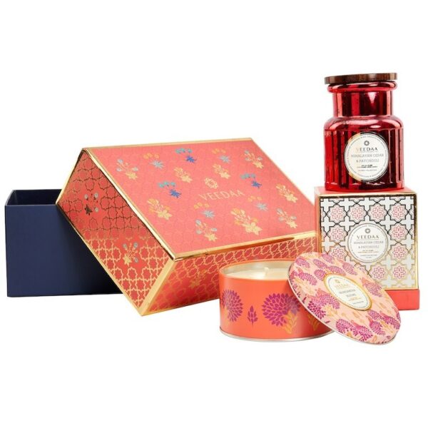 Himalayan Cedar & Patchouli: Smooth & woody Frankincense, Cedarwood & patchouli infused with a touch of mandarin rind. Our clean-burning coconut wax blend is poured into a mercury finish metallic glass with a pure rose wood lid that creates a captivating glimmer as the candle burns. Rich colors adorn the packaging, which reflects a regal and contemporary mosaic design.